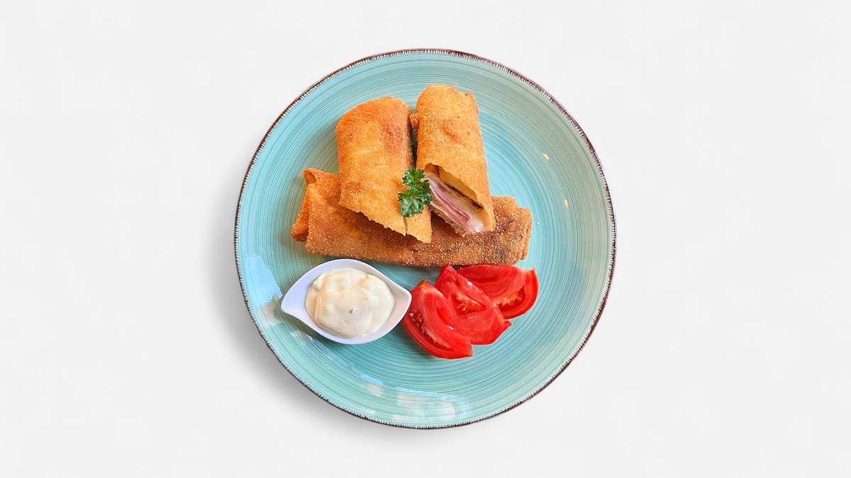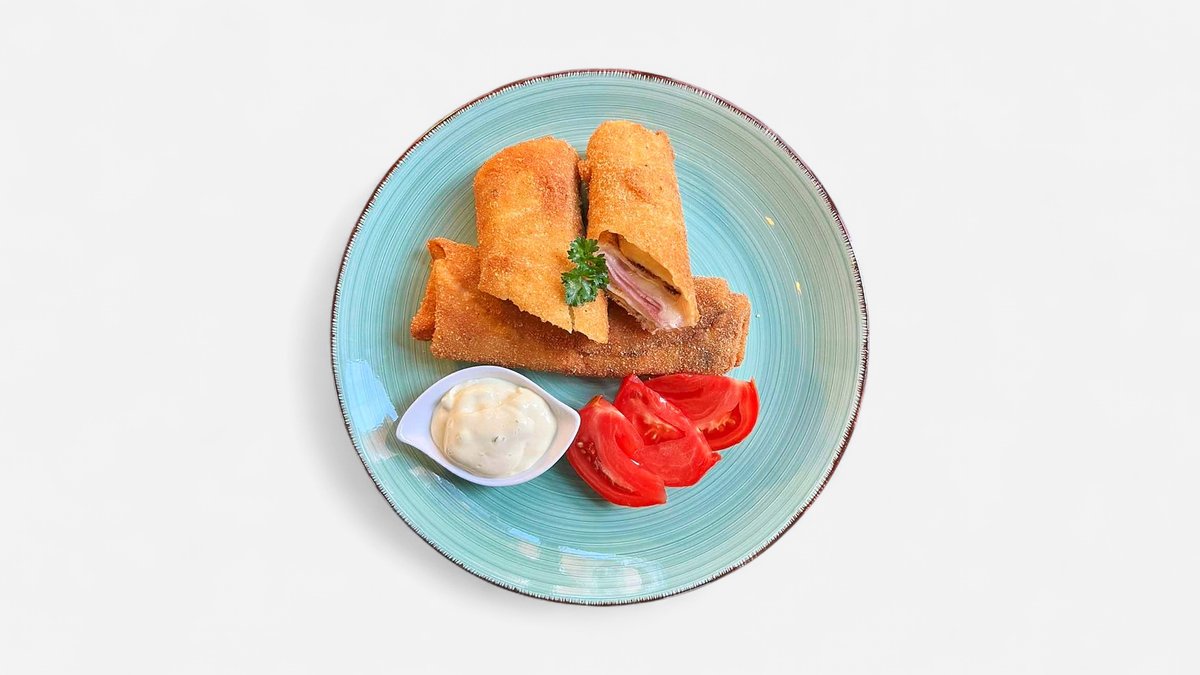 2 pohovane palačinke, suvi vrat, kačkavalj, paradajz, kečap, majonez