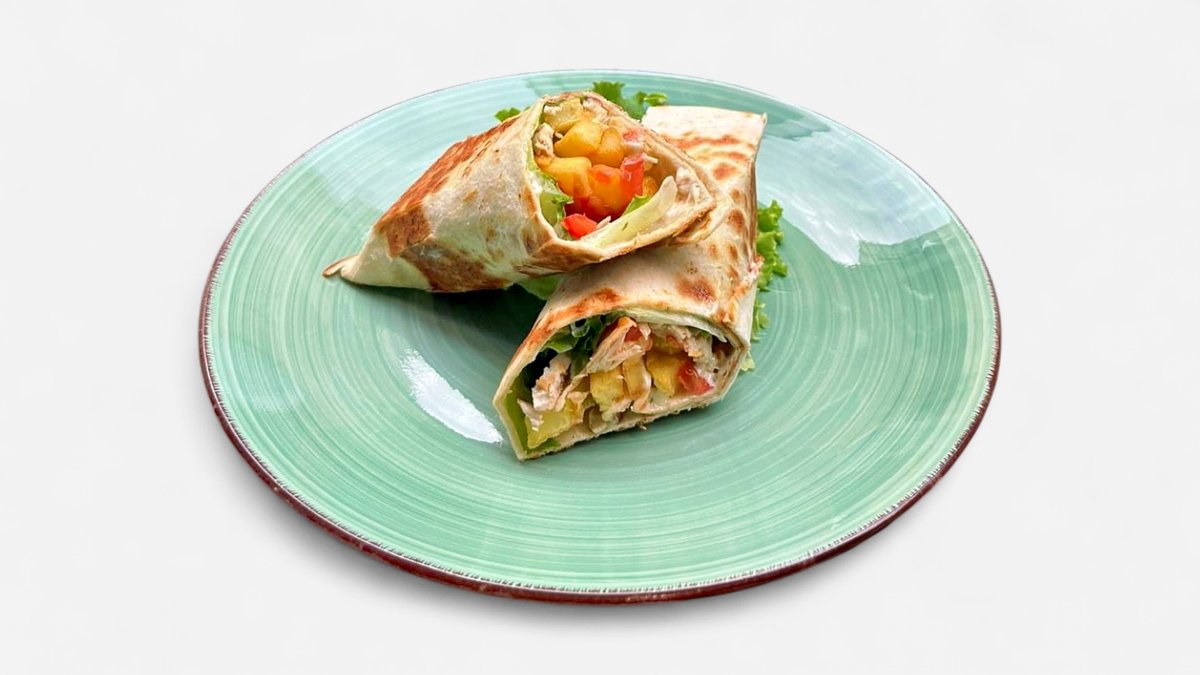 2 tortilje, piletina, pomfrit, iceberg, cezar dresing, paradajz
