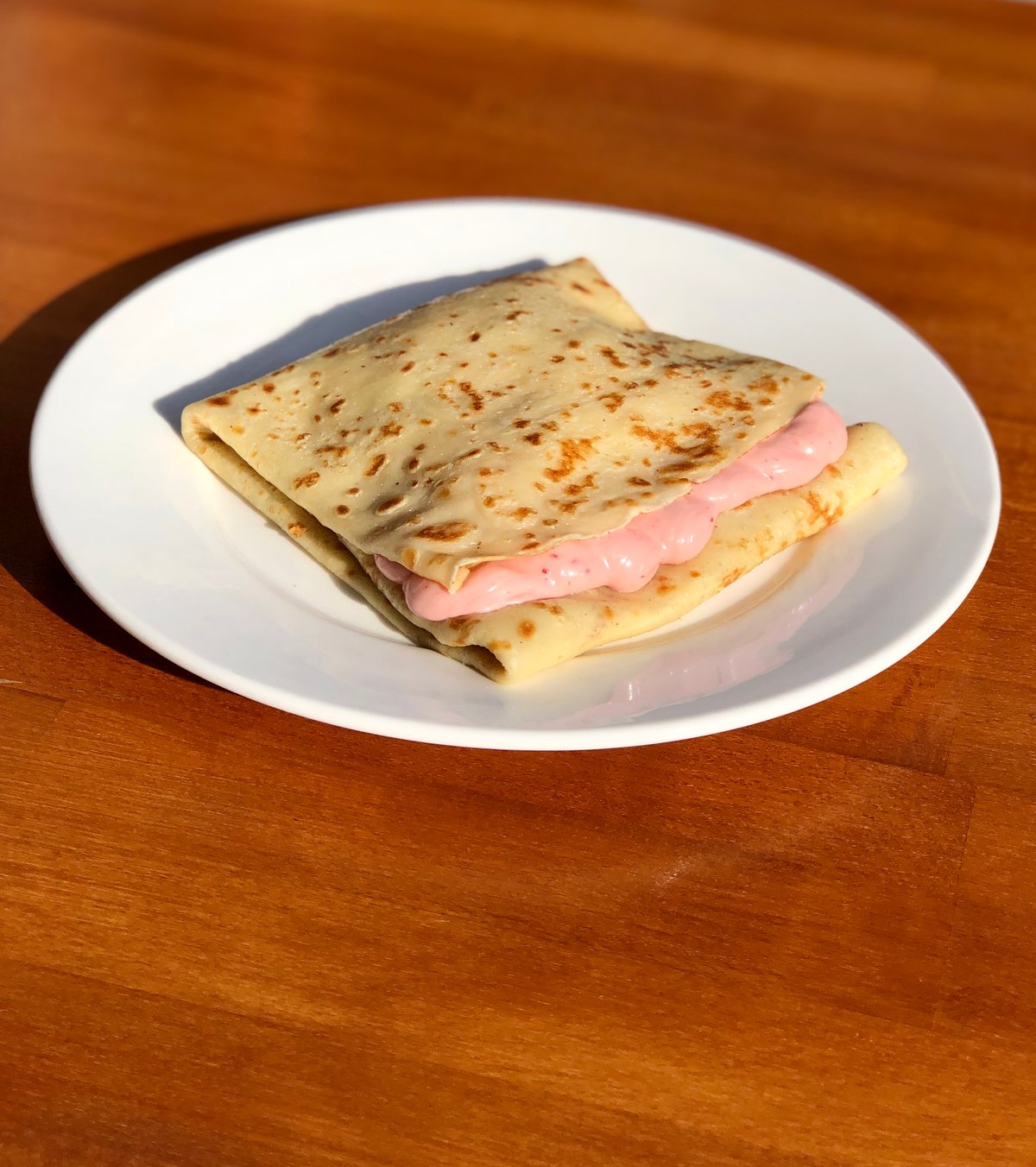 Uživajte u našoj palačinki punjenoj sa mlečnim kremom od jagode. Savršeno slatko zadovoljstvo!