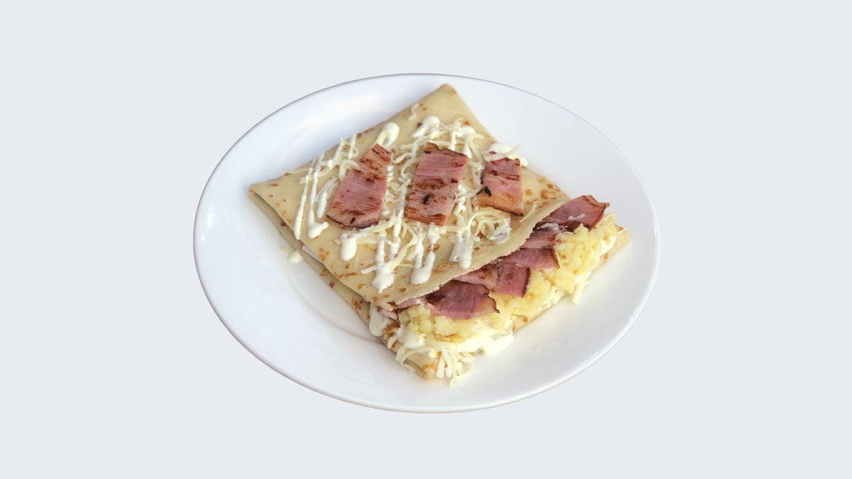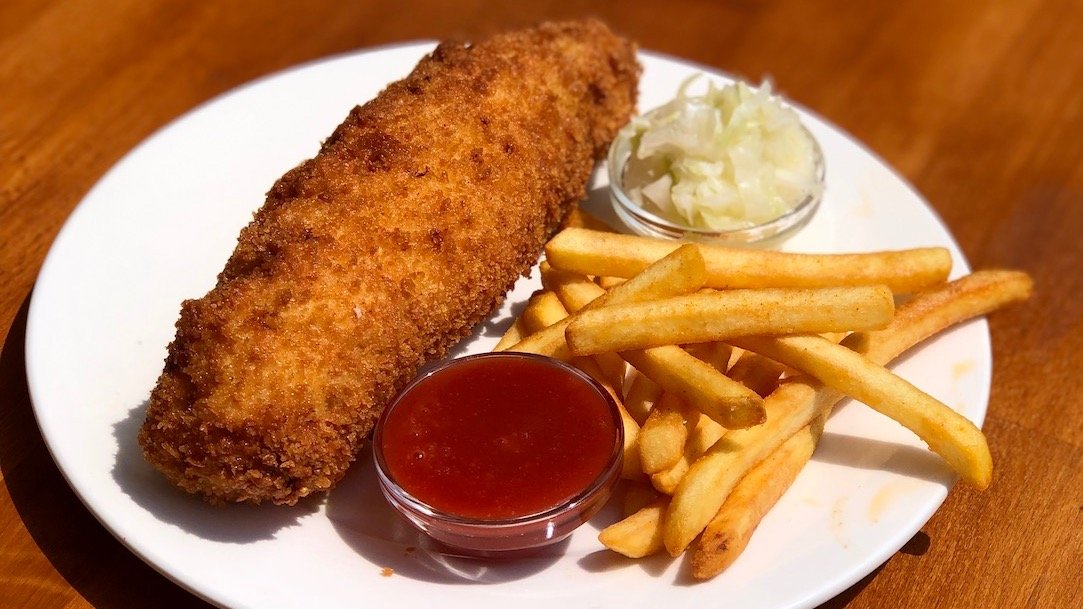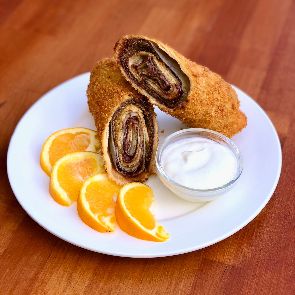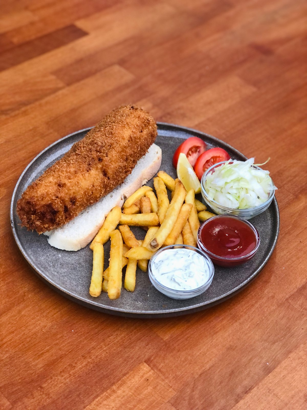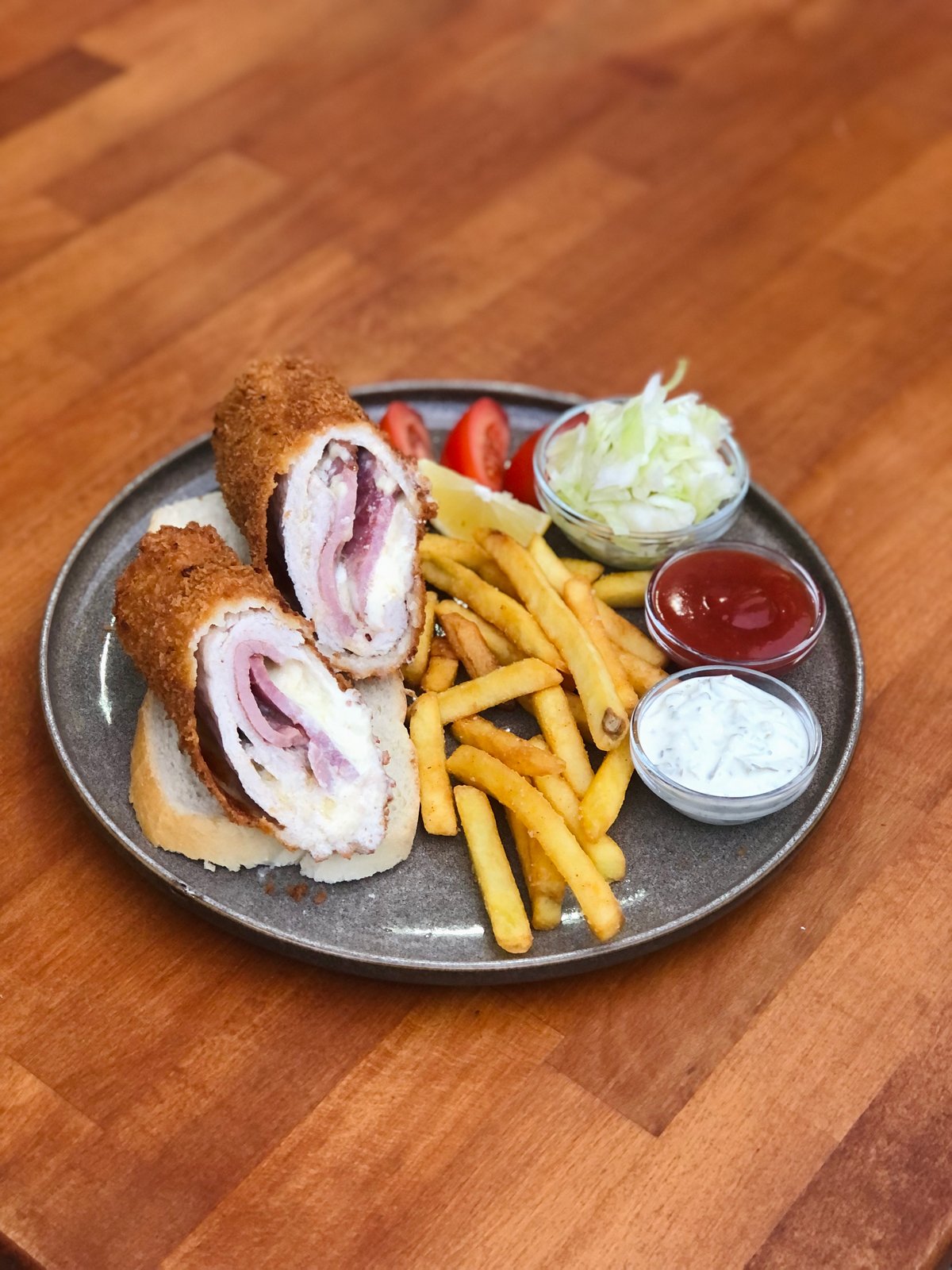 Sočna pileća rolnica punjena dimljenim vratom, kačkavaljem i belim sosom (mešavina majoneza, pavlake i belog luka u prahu), u hrskavom panko pohu. Poslužuje se uz pomfrit i kečap. Klasično, bogato i jako ukusno!