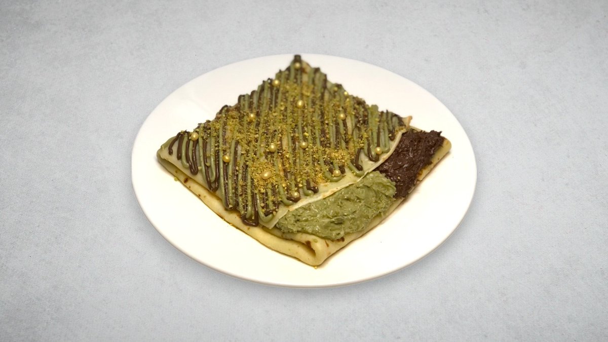 Uživajte Dubai palačinki sa bogatim kremom od pistaća i Nutelle, kadaifom i mlevenim pistaćima.