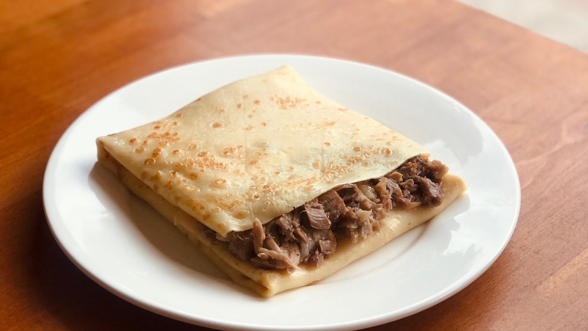 Palačinka sa svinjskim kolencem — domaći klasik u novom ruhu. Sočno, sito, pravo srpski. 200g mesa
