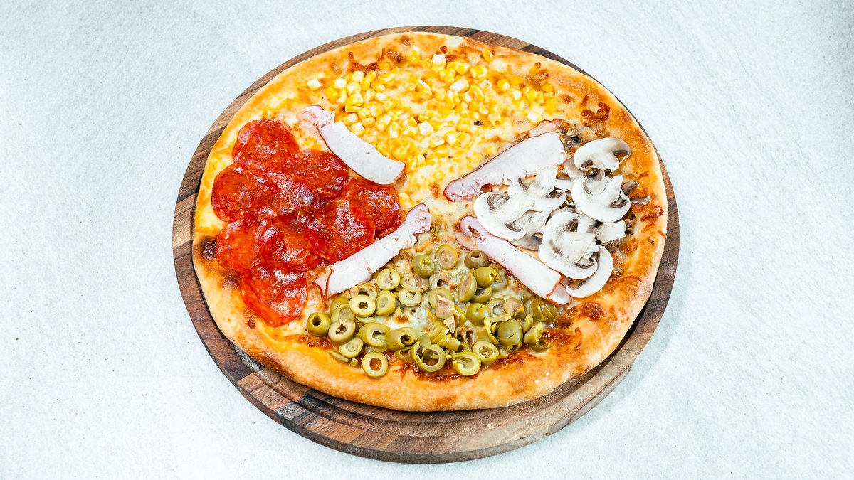 Tomato, sos, pečenica, kulen, kačkavalj, šampinjoni, masline, kukuruz šećerac