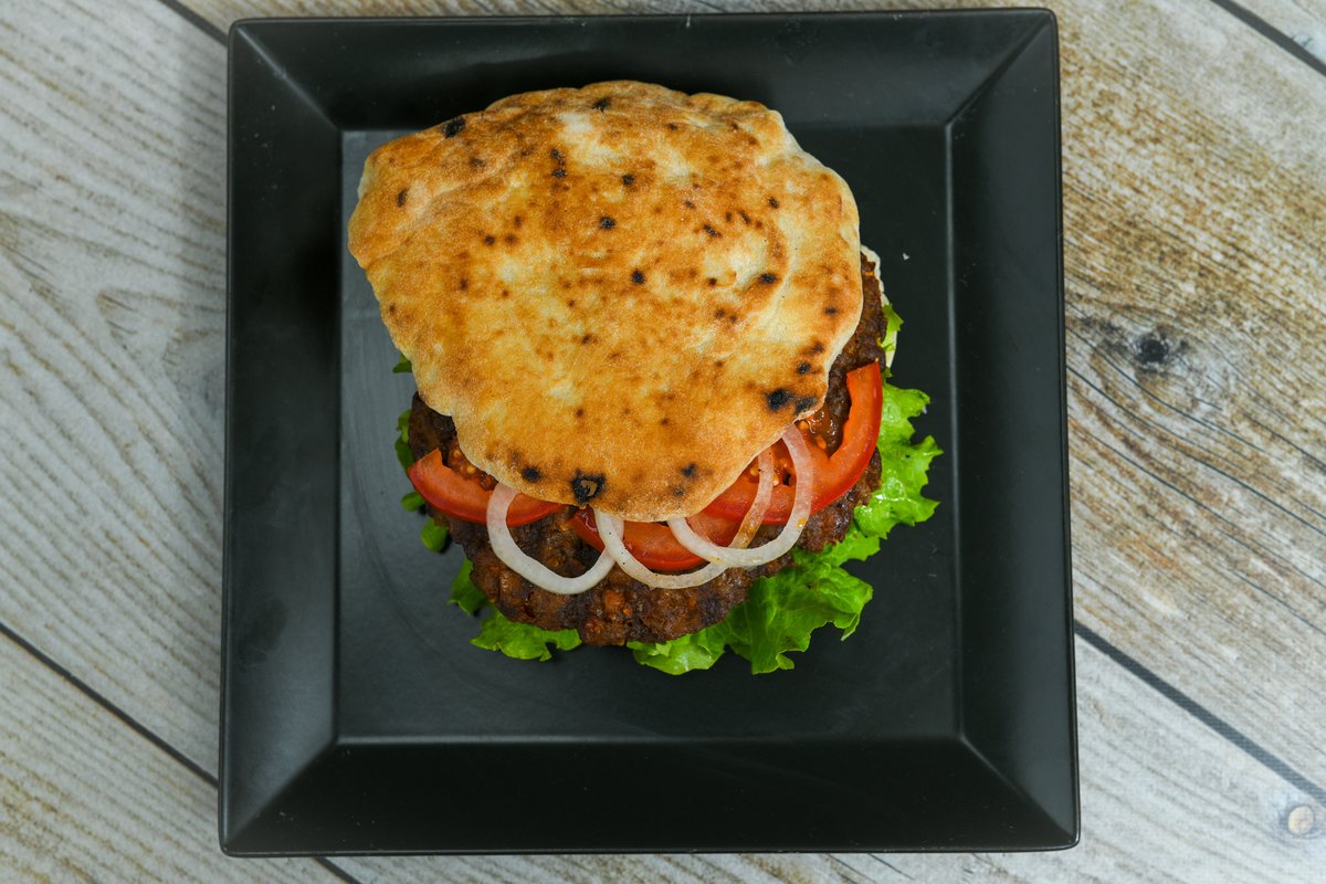 susam zemička, pileći strips sa susamom, tartar sos, grčki sos, paradajz, zelena salata
