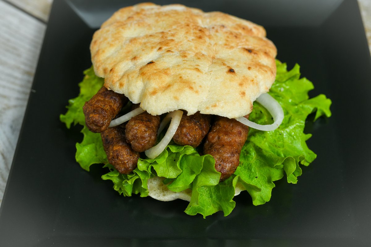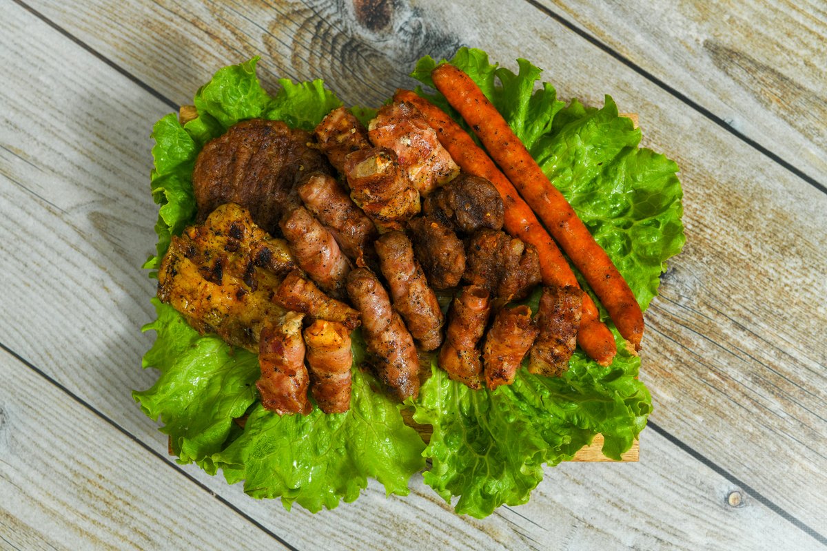 pljeskavice, rolovani ćevapi, uštipci, vojvođanski ražnjići, kobasice, pileći ražnjići, somuni i salata