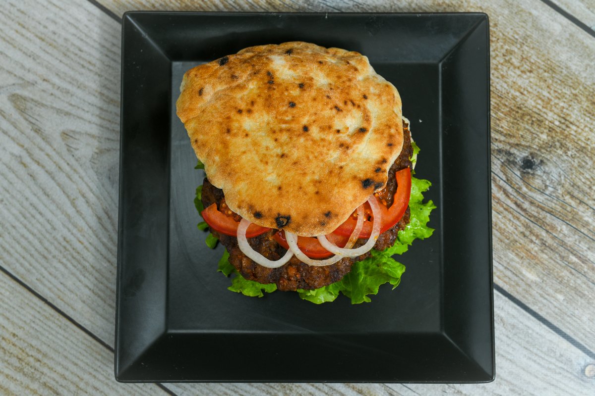 susam zemička, pileći strips sa susamom, tartar sos, grčki sos, paradajz, zelena salata