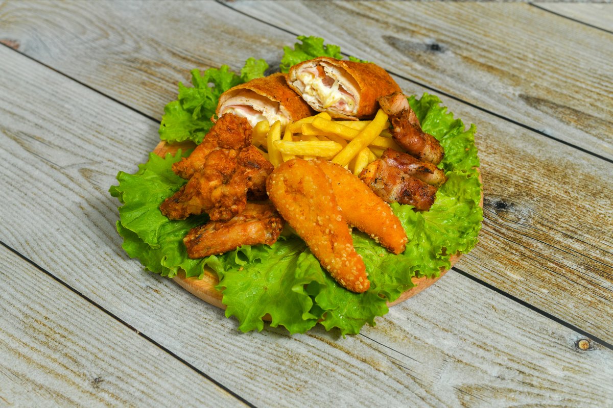 pileće karađorđeve šnicle, hrskava krilca, pileći susam štapići, ražnjići, pomfrit - 600g mesa + 200g pomfrita