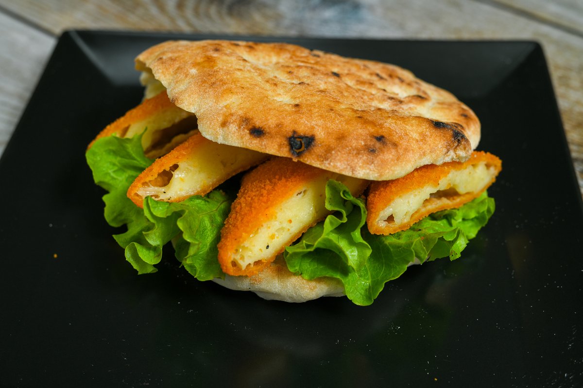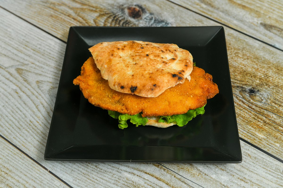 pileća bečka šnicla u somunu, tartar sos, pavlaka, zelena salata