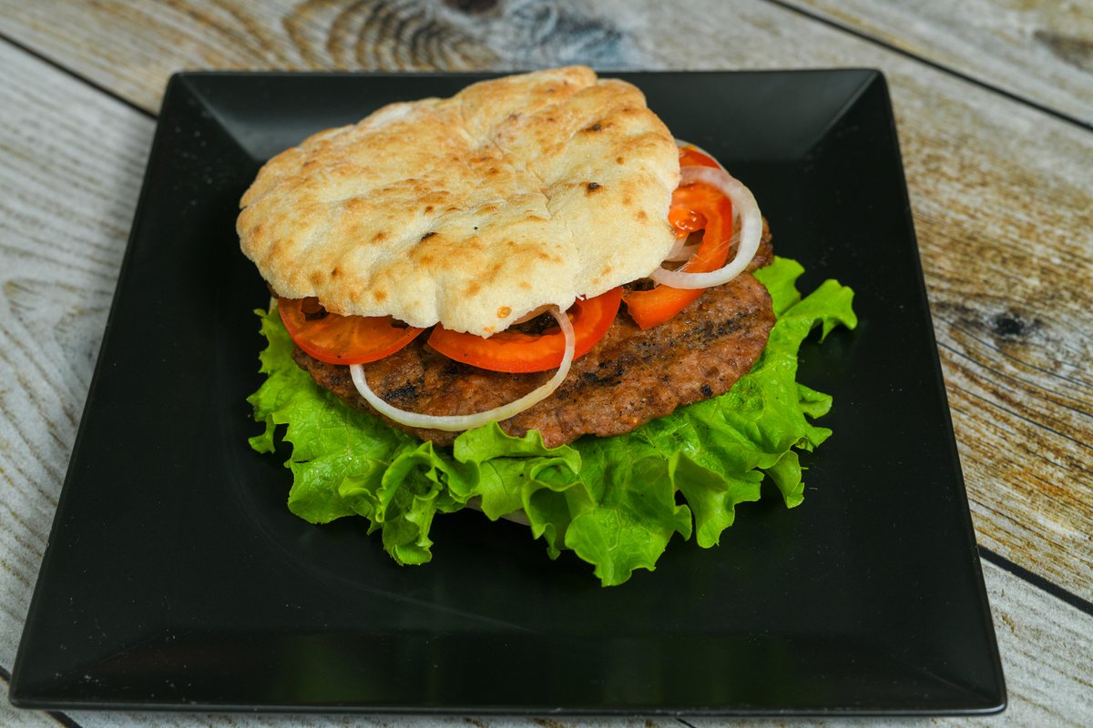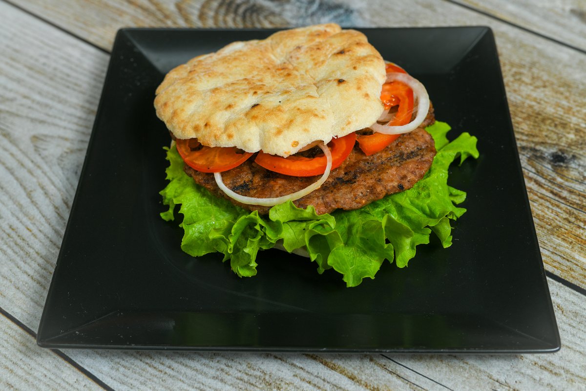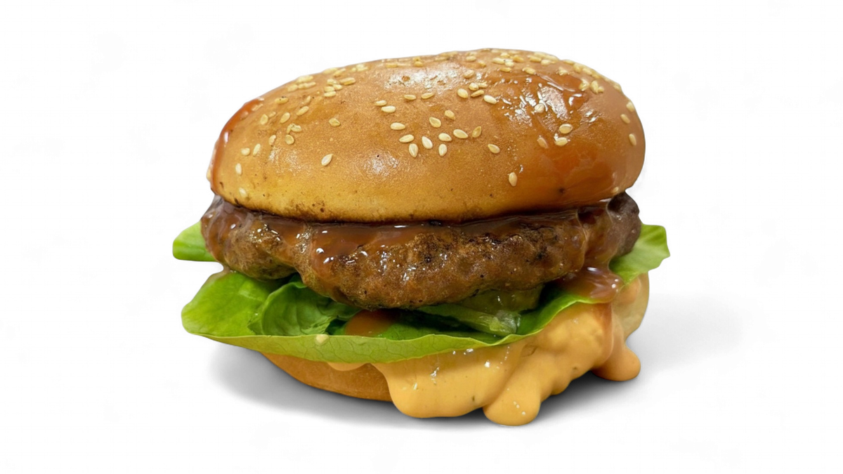 susam zemička, juneće meso sa dimljenom slaninom 170g, ljuta paprika, burger sos, kečap ili majonez, paradajz, zelena salata