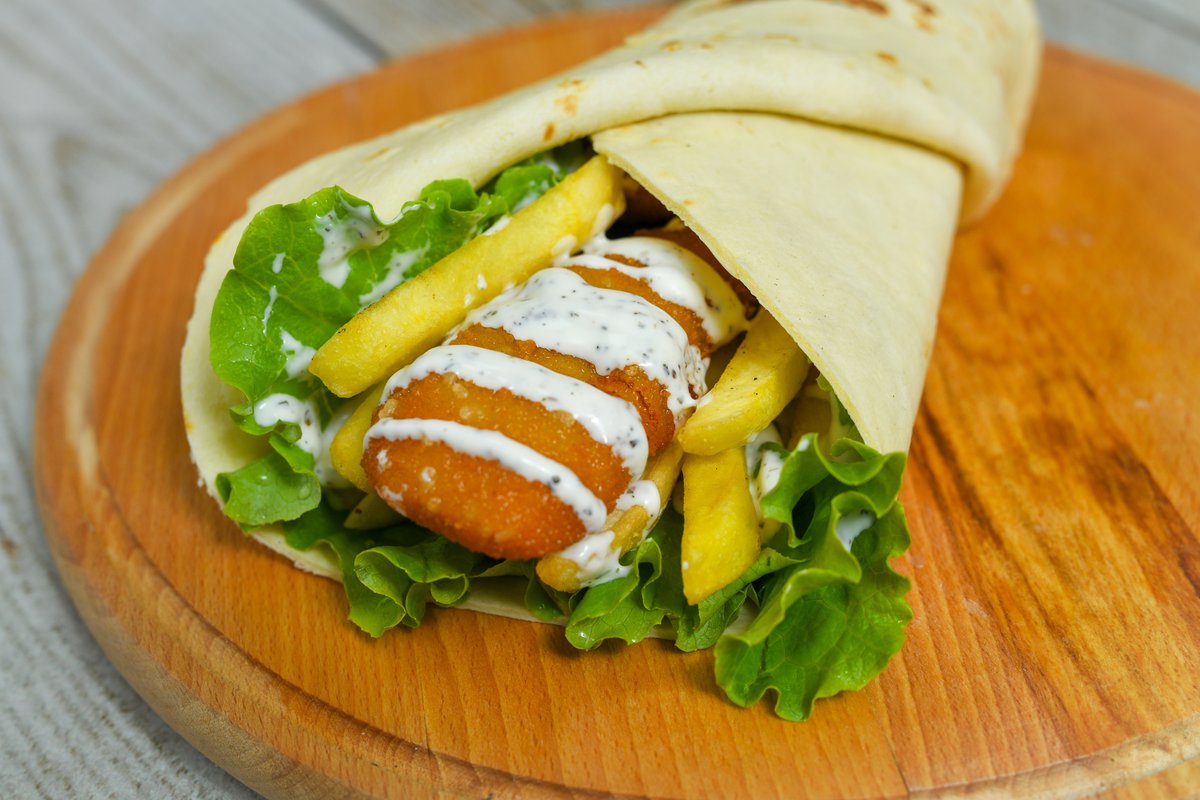 pileći susam štapići u tortilji, pomfrit, tartar sos, pavlaka, zelena salata - 200g