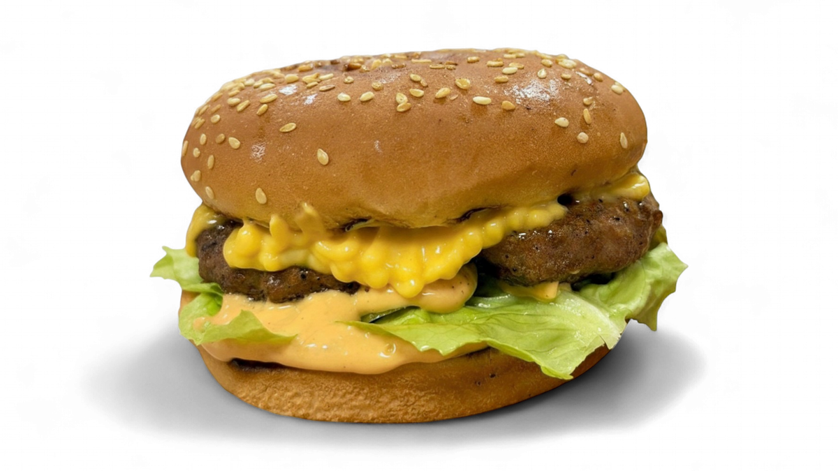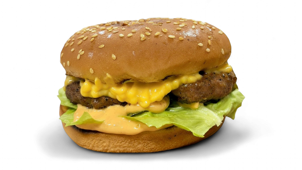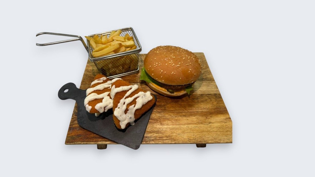 susam zemička, juneće meso 140g, burger sos, kečap ili majonez, kiseli krastavci, zelena salata, pomfrit 200g, pohovani sir 150g, grčki preliv