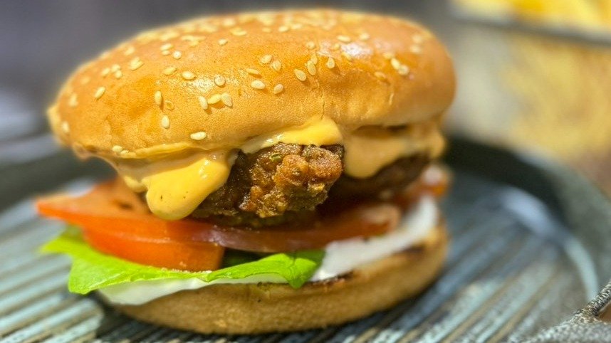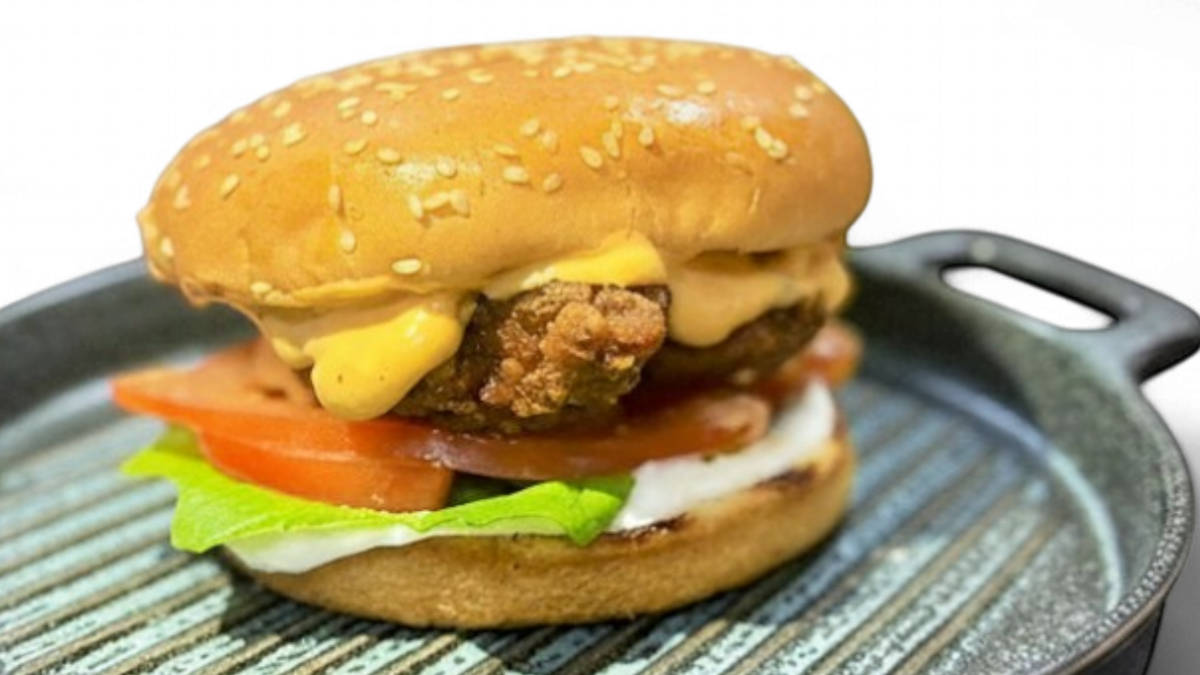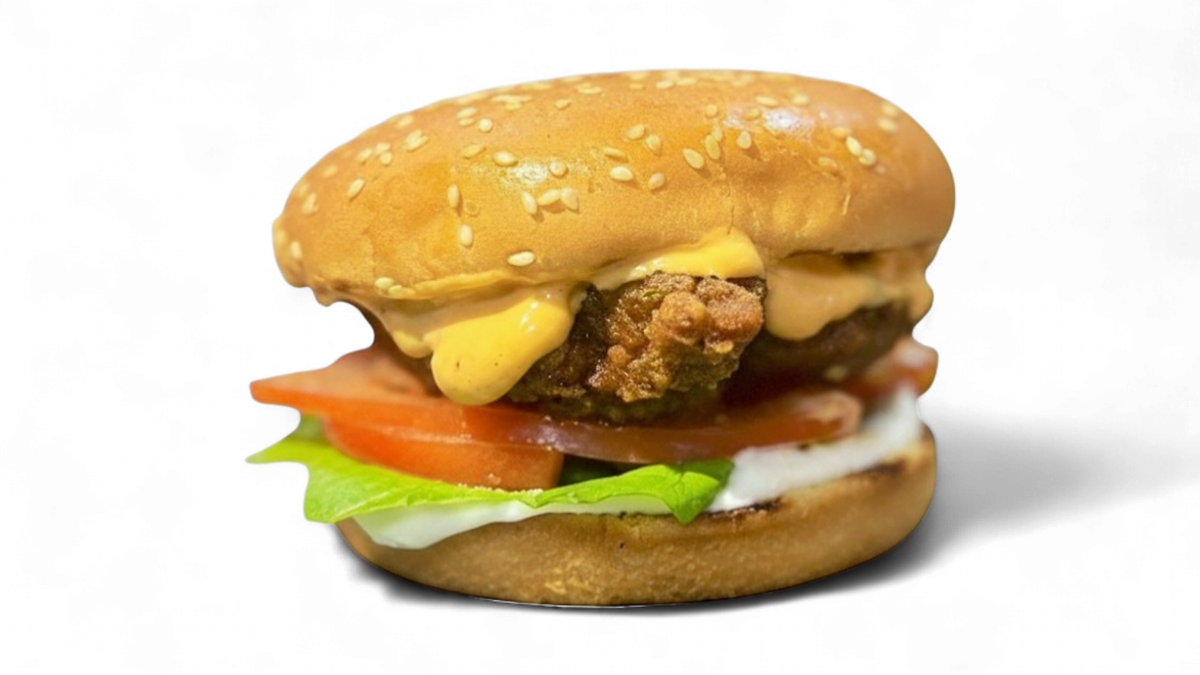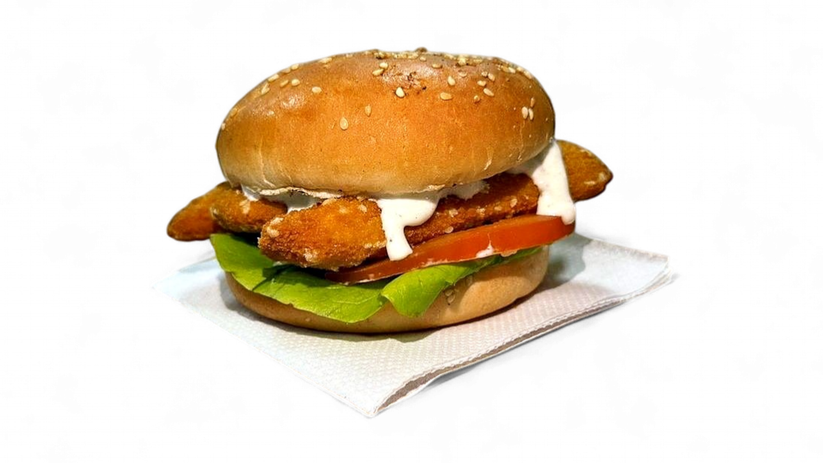 susam zemička, pohovani pileći file, burger sos, čedar sos, paradajz, zelena salata