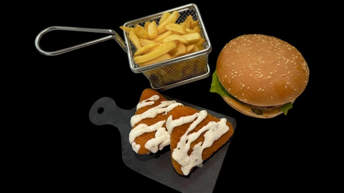 susam zemička, pohovani file, burger sos, kečap ili majonez, zelena salata, kiseli krastavci, pomfrit, pohovani sir i grčki sos
