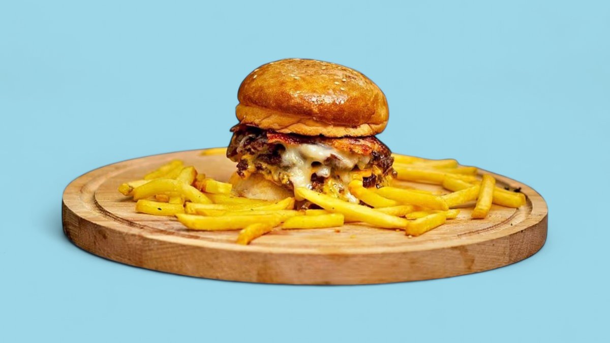 2x70g 100% junece meso, 2x cheddar sir BBQ sos, hrskavi luk, gorgonzola, panceta