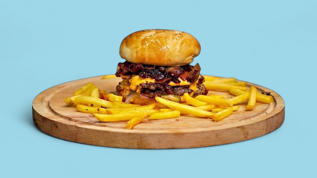 2x 70g 100% juneće meso, 2x cheddar sir, bbq sos, onion rings, japaleño paprika