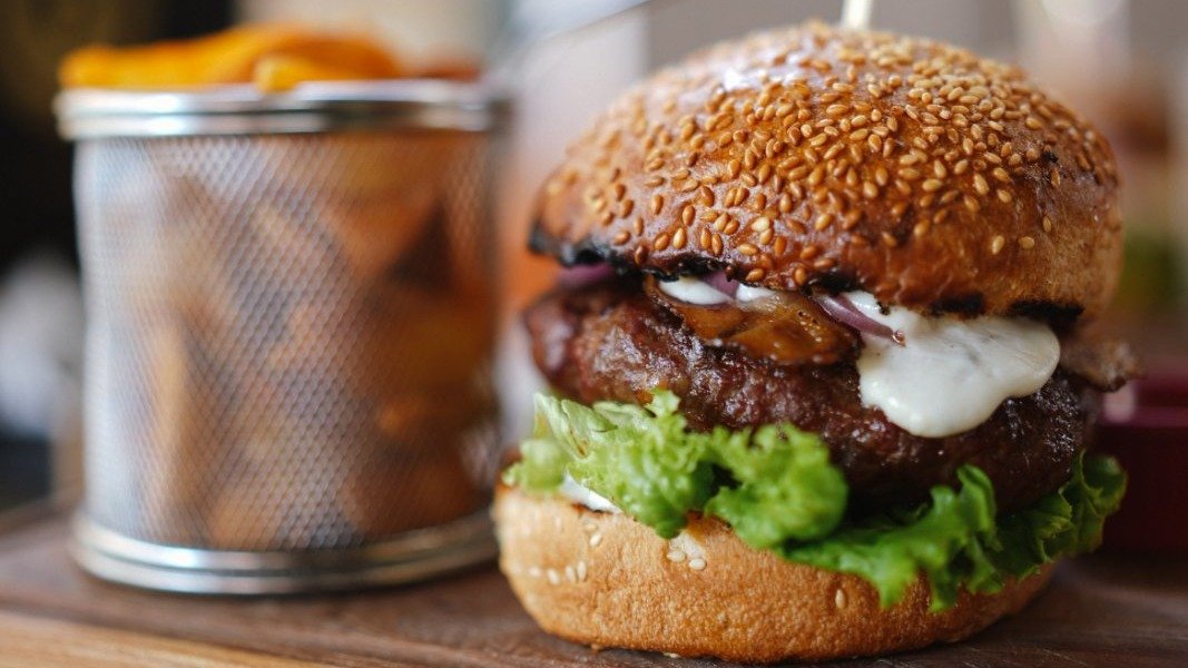 Burger od 100% junećeg mesa ( 200gr ), zelena salata, paradajz, čedar sir, kiseli krastavčići, burger sos, pomfrit.