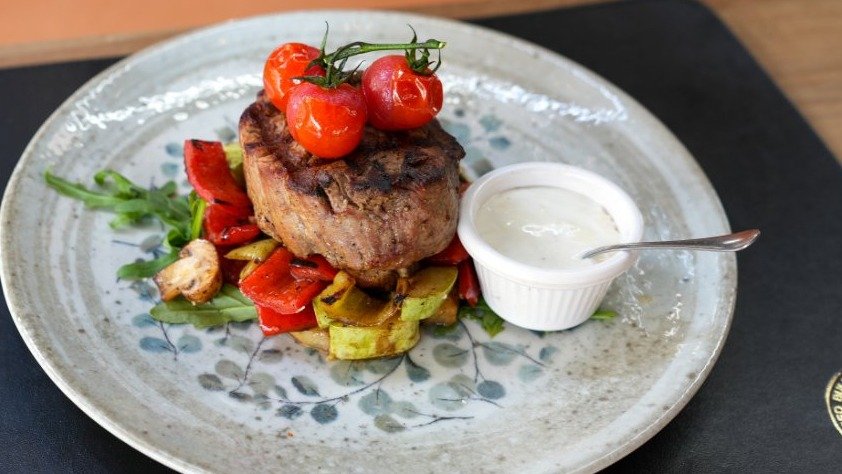 Biftek 130gr, mix zelenih salta, crveni luk marinirani, ceri paradajz, crvena paprika, gorgonzola dresing, parmezan