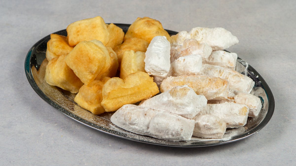 Oblikovano testo prženo u ulju i posuto šećerom u prahu