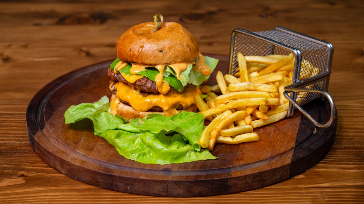 2x 100g mešanog mesa, cheddar sir, kiseli krastavčići, majonez, slaninica, zelena salata, burger sos i pomfrit
