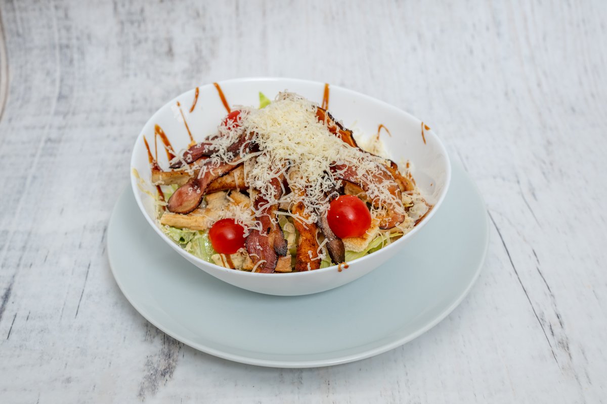 Zelena salata, paradajz, slanina, piletina, masline, origano, tost, parmezan, preliv, limun, maslinovo ulje