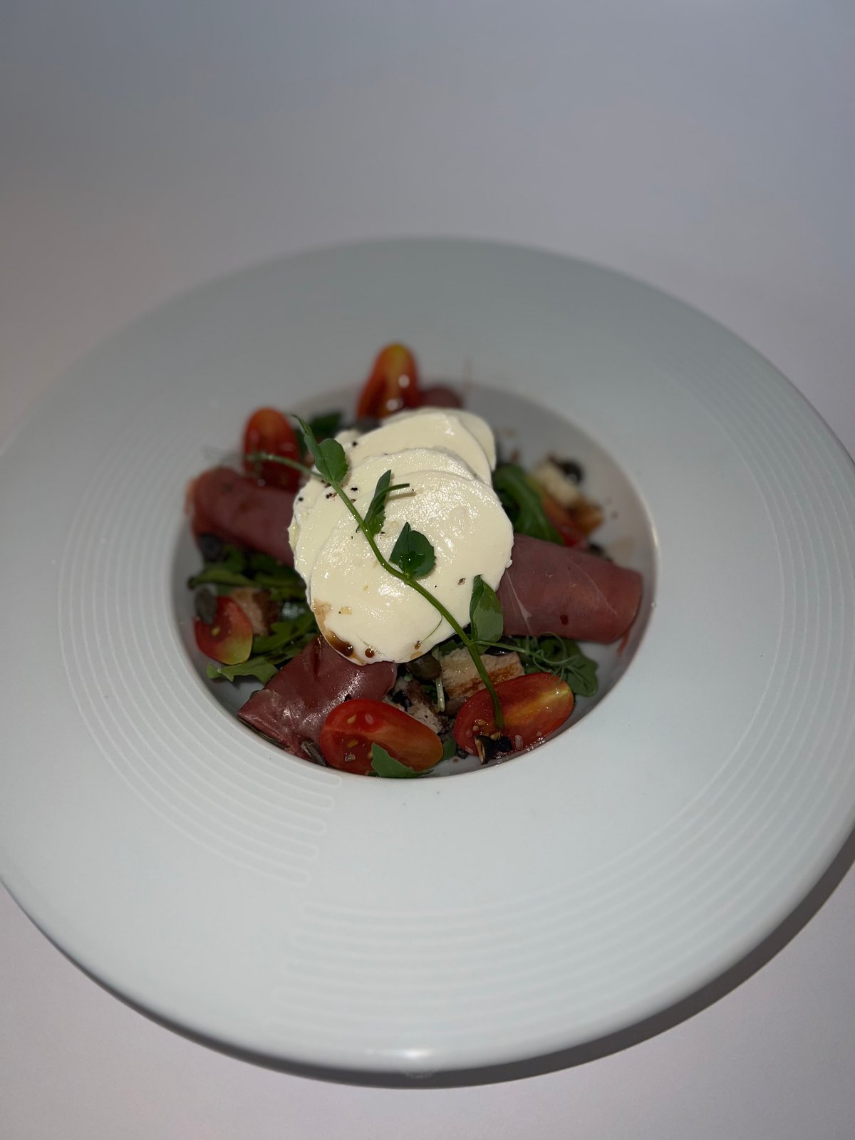 Rukola, čeri, mocarel, pršut, aćeto dresing
