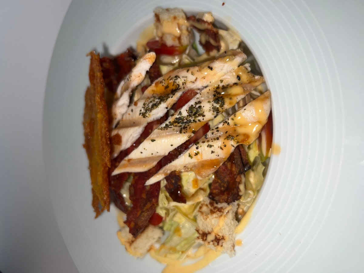 Piletina, pančeta, iceberg salata, čeri paradajz, krutoni od hleba, cezar dresing