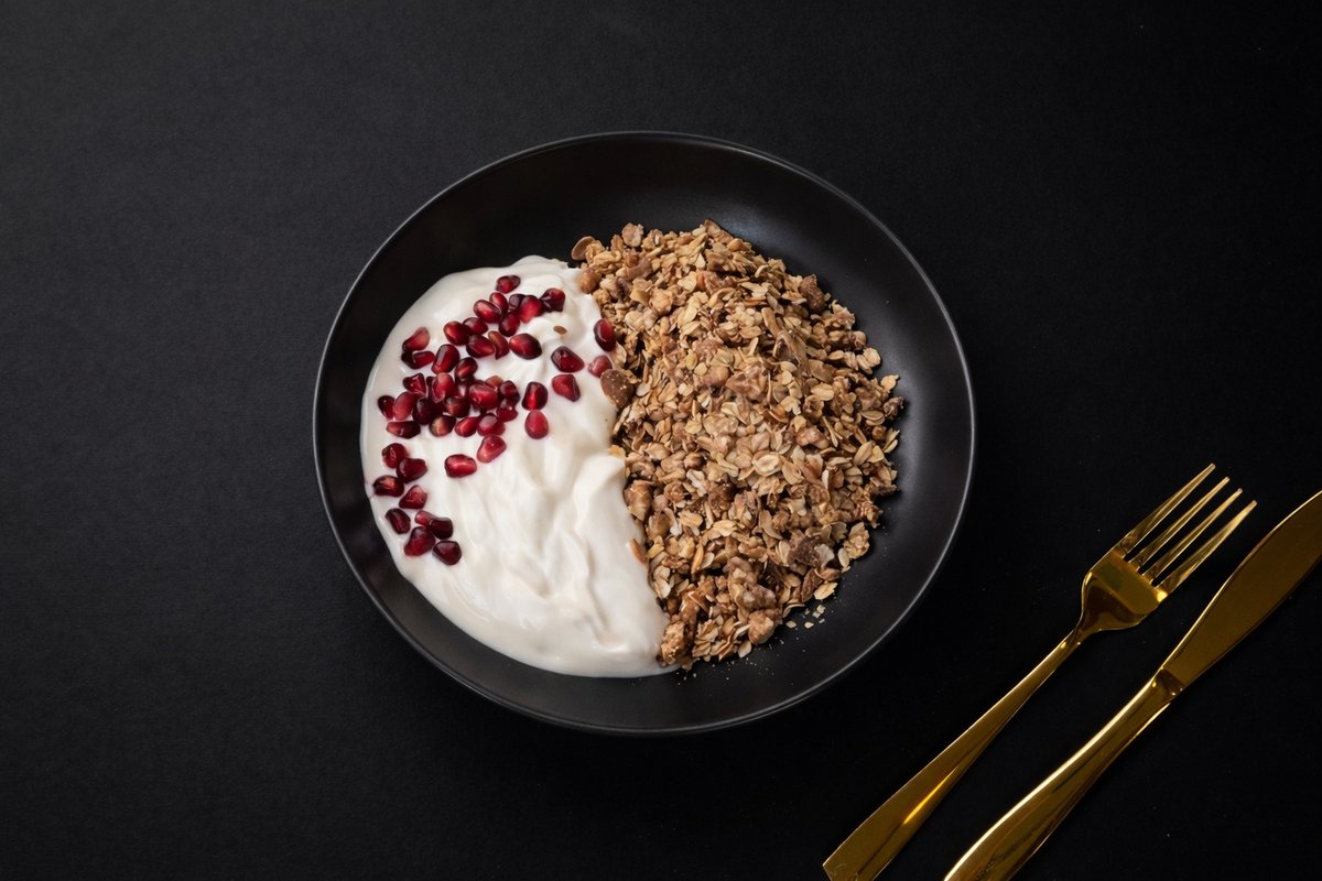 bez dodatog šećera homemade granola - ovsene pahuljice, orasi, lešnik, med, laneno seme, kikiriki puter, grčki jogurt + voće