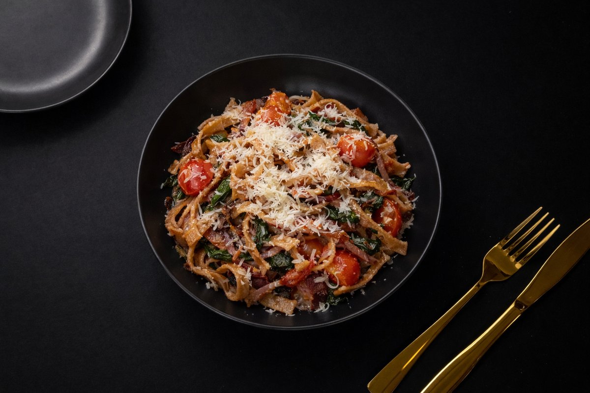 Slanina, šampinjoni, pavlaka, parmezan, čeri paradajz, masl.ulje, biber