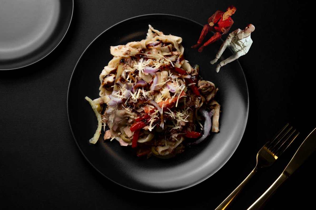 Dimljena piletina, pečurke, crni I beli luk, susam, pavlaka, biber, peršun, parmezan porcija 300~400g