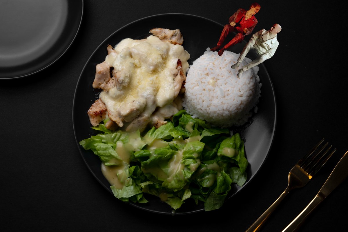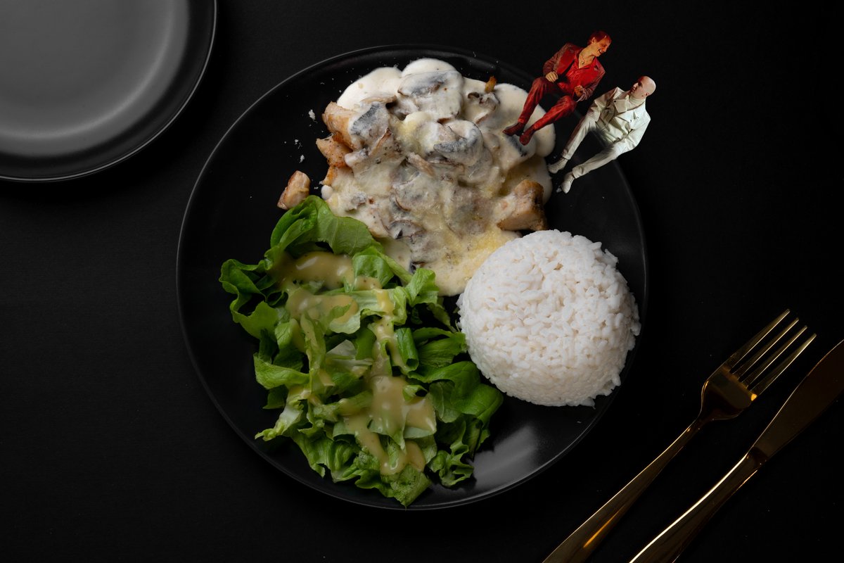 pileći file 200g, šampinjoni, neutralna pavlaka, kačkavalj, pirinač, zelena salata