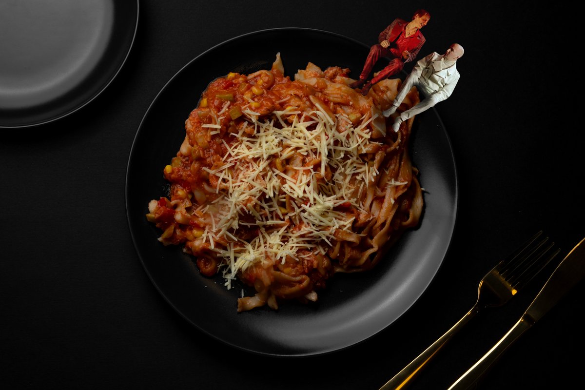 posna testenina, soja ljuspice, paradajz sos, sargarepa, luk, biljni kackavalj