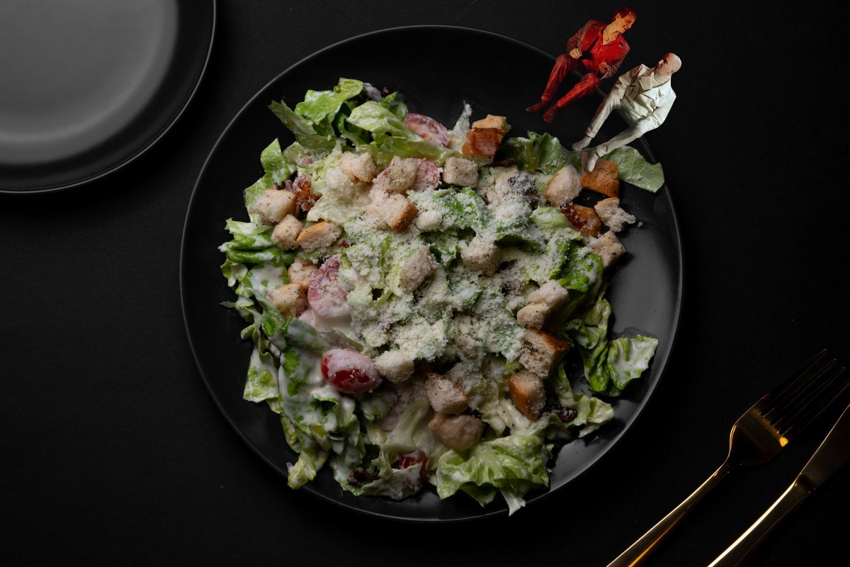 Piletina, slanina, zelena salata, čeri paradajz, dresing, parmezan, krutoni