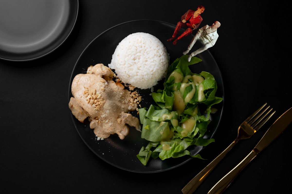 pileći file 200g, kikiriki puter, neutralna pavlaka, pirinač, zelena salata