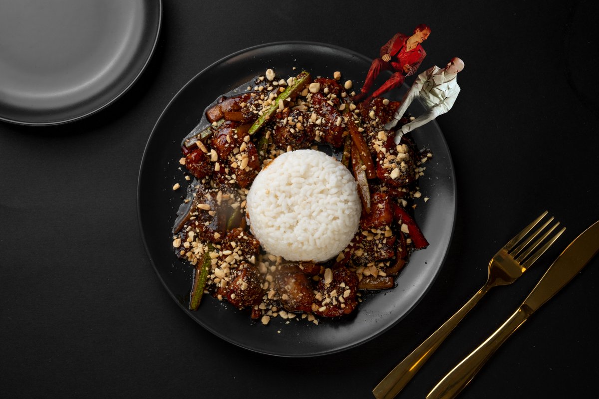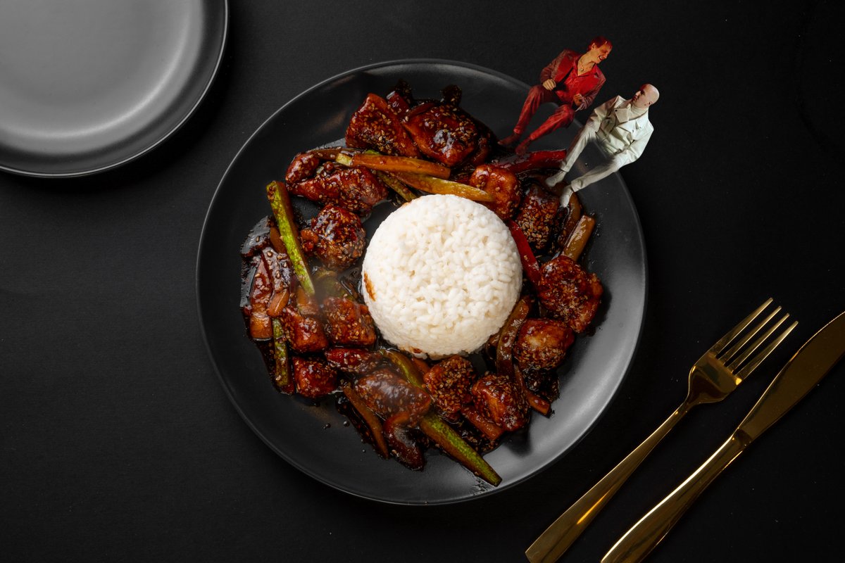 180g piletine u susamu sa medom i soja sosom, crvena paprika, luk, tikvica i pirinač