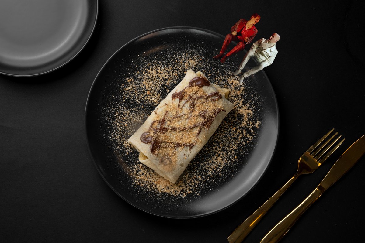 Dubai palačinka filovana kadaifom i pistać kremom sa topingom od čokolade i mrvicama pistaća