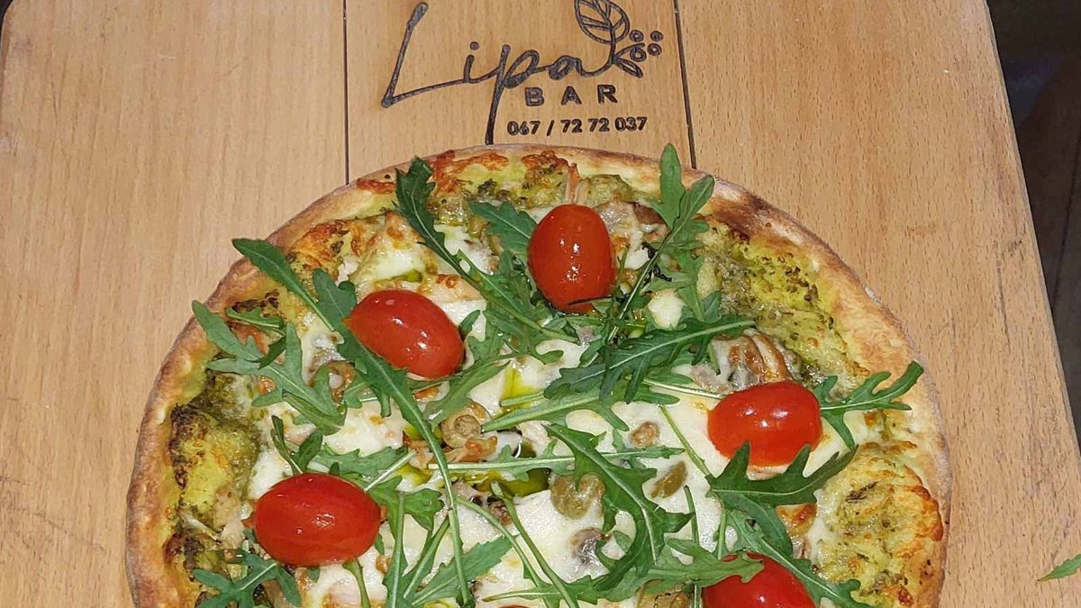 pesto sos, pica sir, mocarela, pečurke, dimljeno belo meso, čeri paradajz, rukola, masline