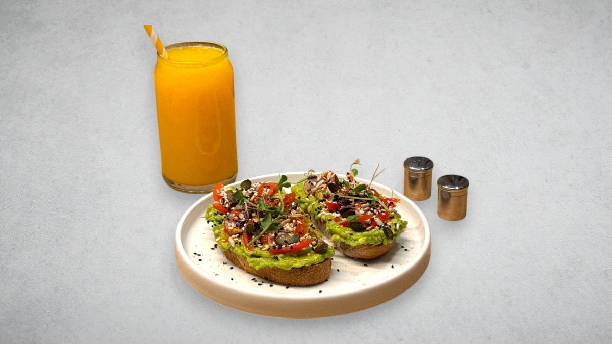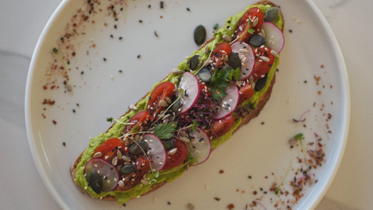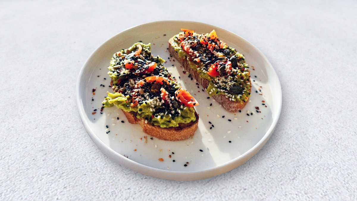 Pasirani avokado na beskvasnom hlebu sa dodatkom cherry paradajza i rotkvice, posut semenkama suncokreta, susama i bundeve, peršunom i mikro biljem