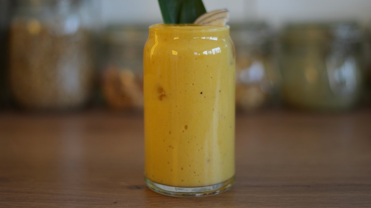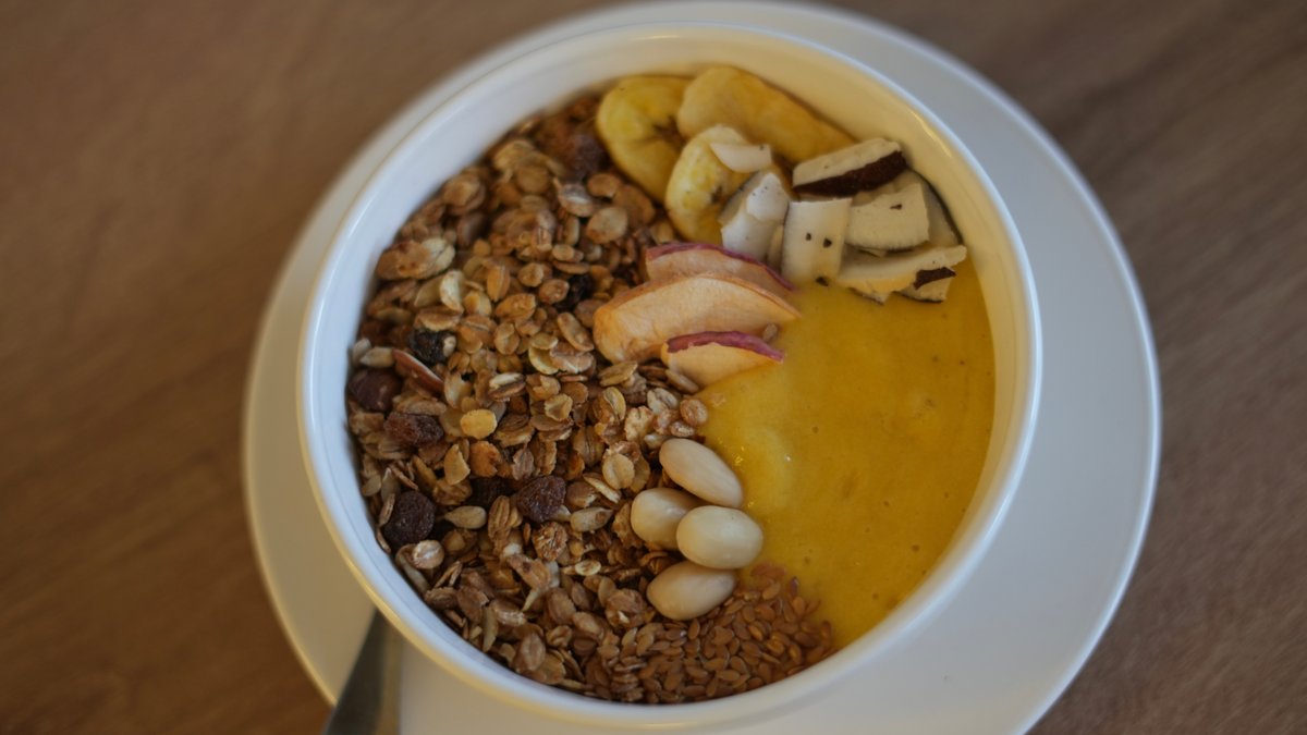 Osvežavajući mix banane, ananasa i manga sa dodatkom granole(integralne žitarice, semenke, orašasto voće, cimet i med), chia semenki, lanenih semenki, listića badema, lešnika, kokosa