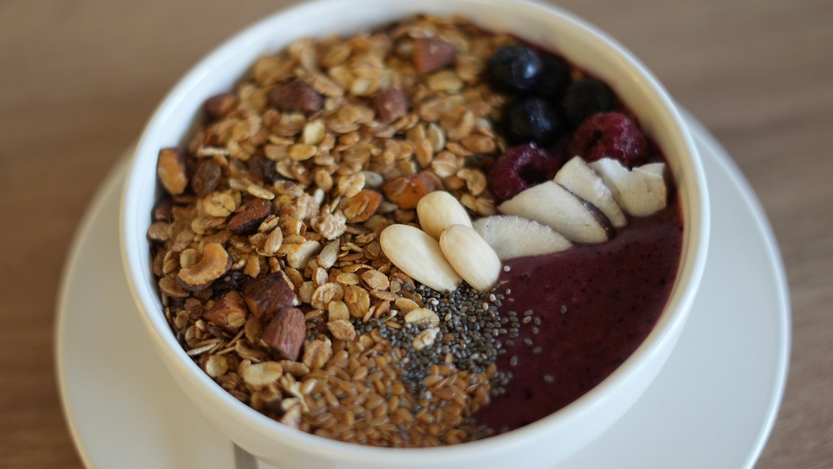Osvežavajući mix banane, asai bobica, jagode i borovnice sa dodatkom granole(integralne žitarice, semenke, orašasto voće, cimet i med), chia semenki, lanenih semenki, listića badema, lešnika, kokosa