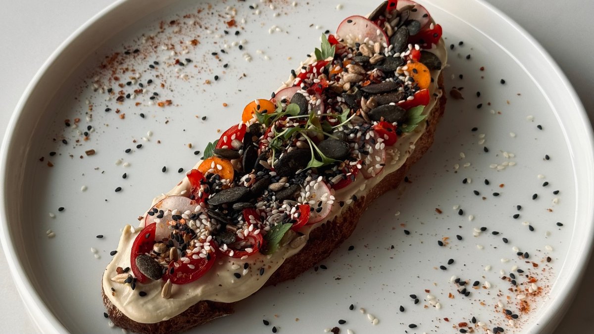 Humus namaz na beskvasnom hlebu sa dodatkom cherry paradajza i rotkvice, posut semenkama bundeve, belog i crnog susama i suncokreta