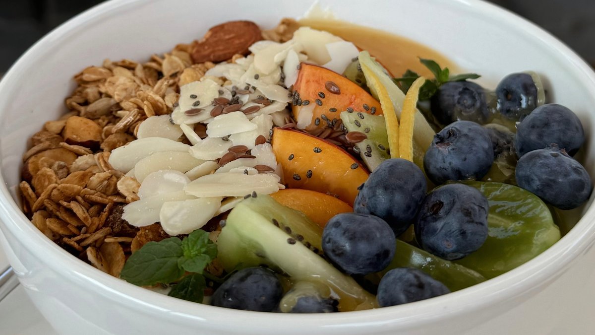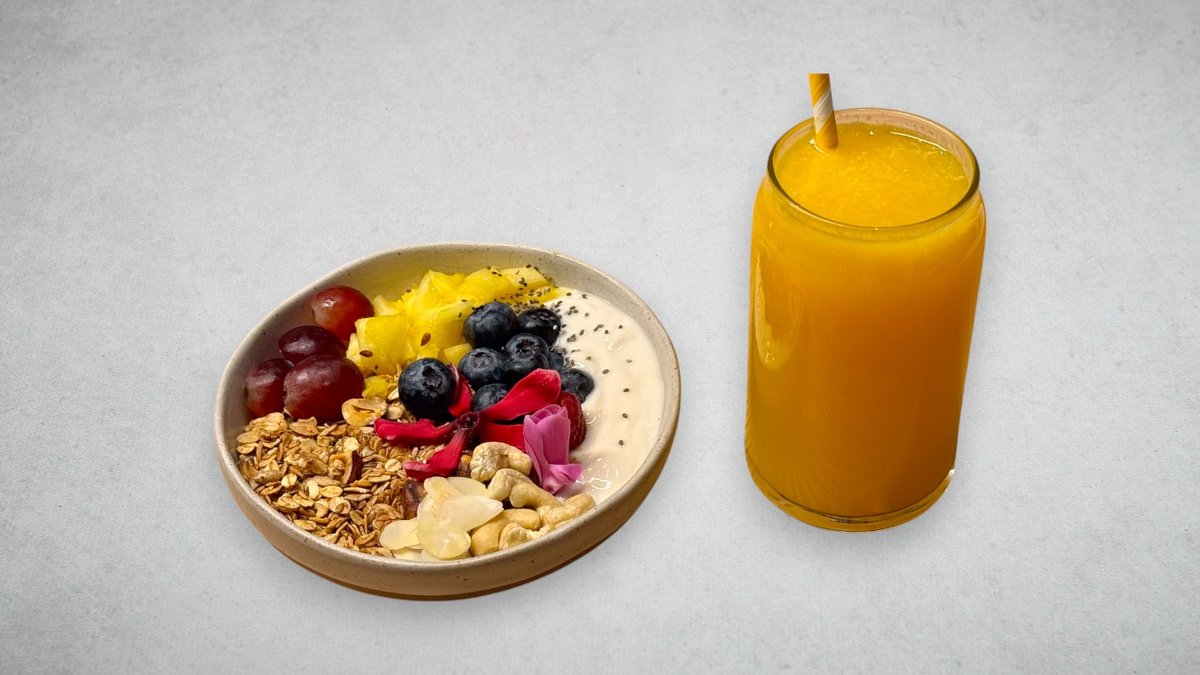 Domaća granola od integralnih žitarica, semenki, badema, lešnika i indijskog oraha sa biljnim grčkim jogurtom, ananasom, borovnicama i javorovim sirupom + hladno ceđeni sok od narandže