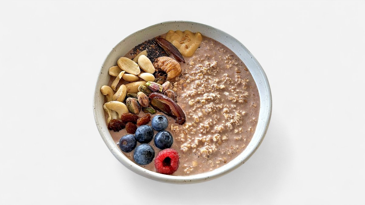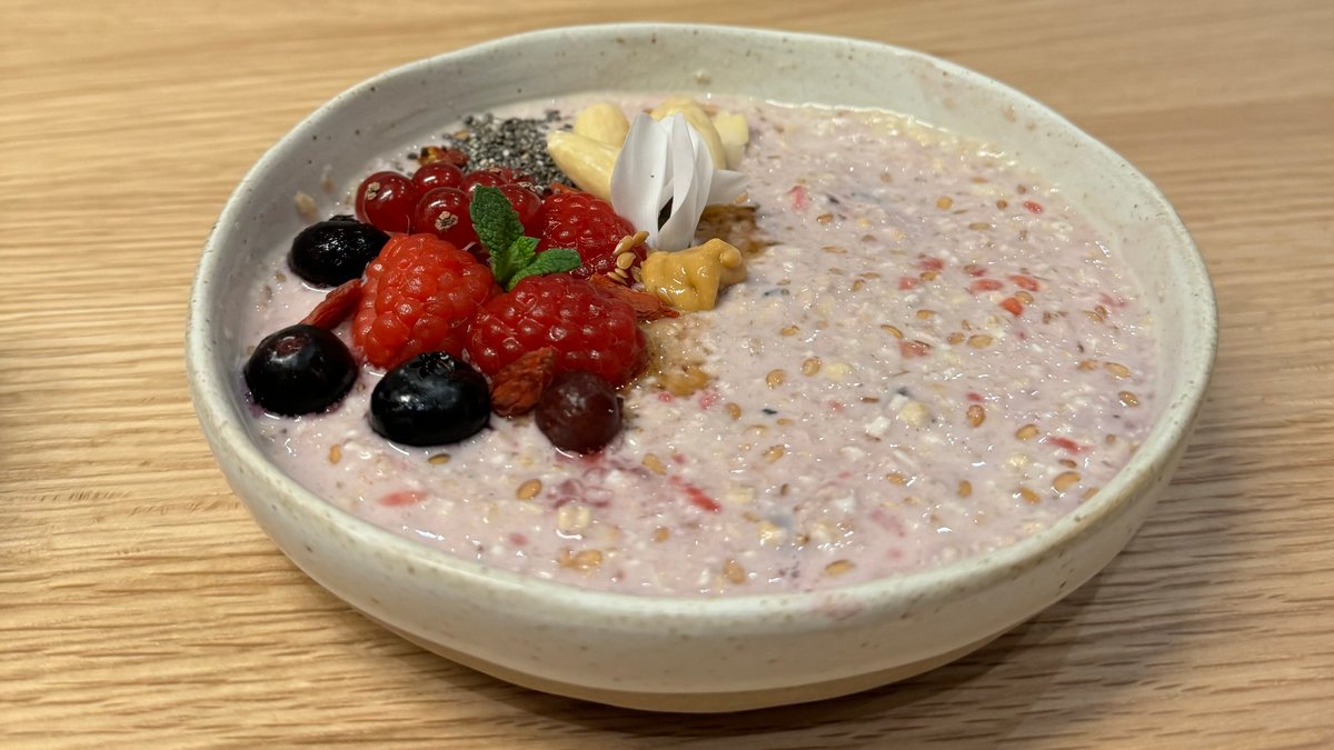 organske ovsene pahuljice, godži bobice, chia semenke, açai bobice, borovnica, malina, javorov sirup, orašasto voće