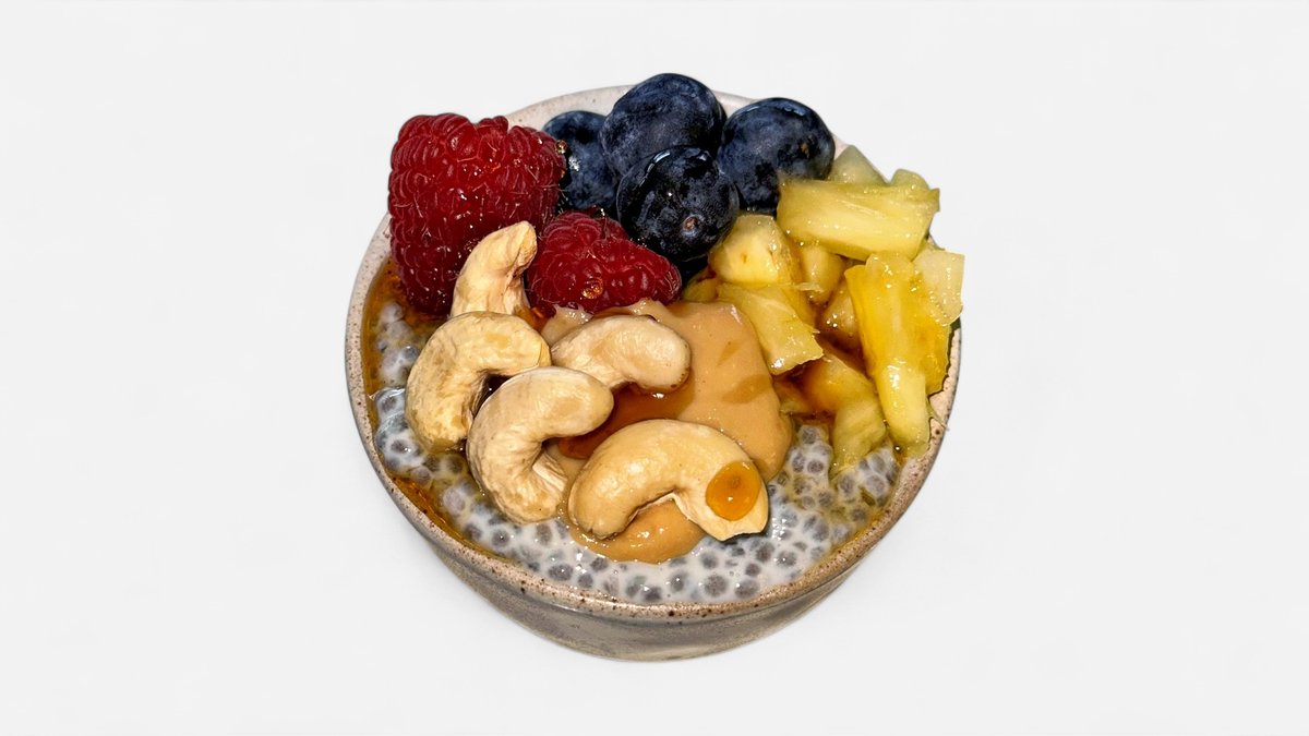 organske chia semenke, biljno mleko, biljni jogurt, javorov sirup, borovnica, malina, banana, ananas, kikiriki puter, indijski orah