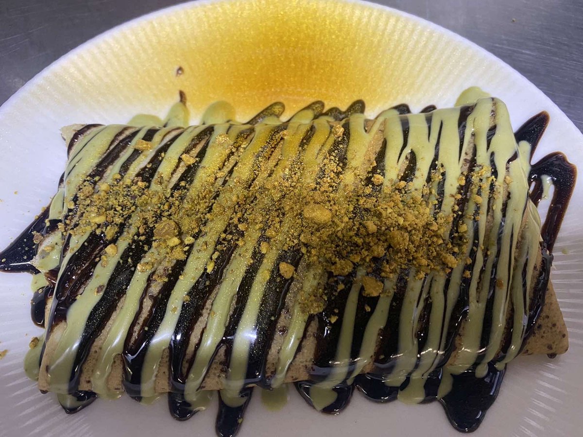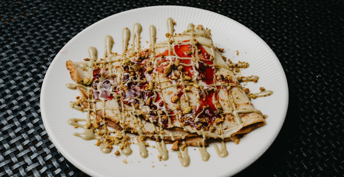 sa mocarelom, spanacem, susenim paradajzom, ceri paradajzom serviran na tortilji premazanoj toplienim sirom od kozijeg mleka