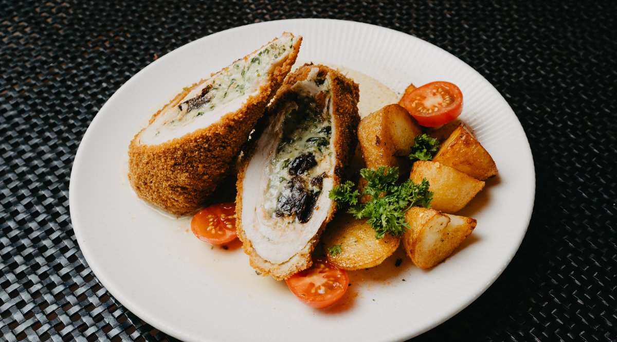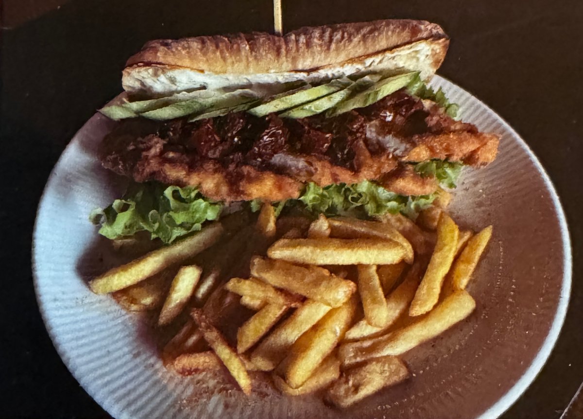 Pohovani pileći file, sušeni paradajz, krastavac, zelena salata, tartar sos, domaća hleb-ćabata, pomfrit