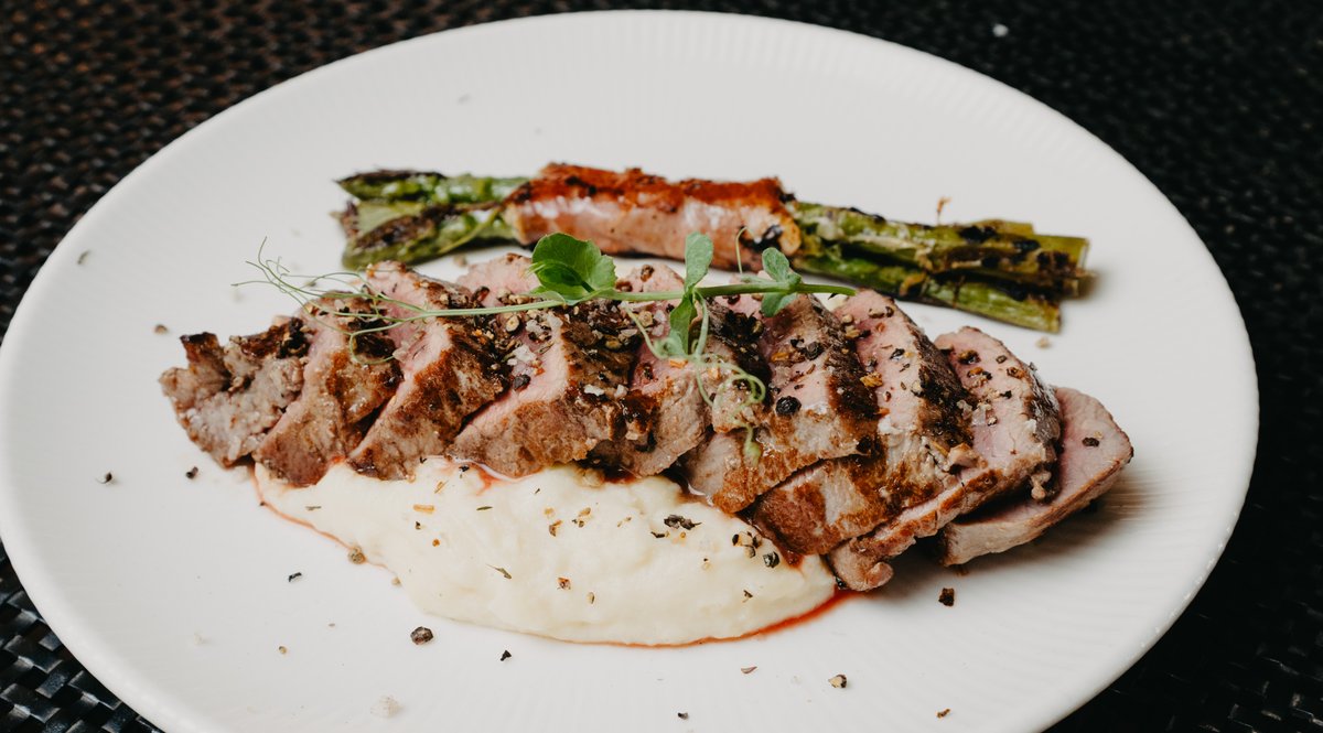 preliven maslinovim uljem i začinskim biljem sa pireom i šparglom