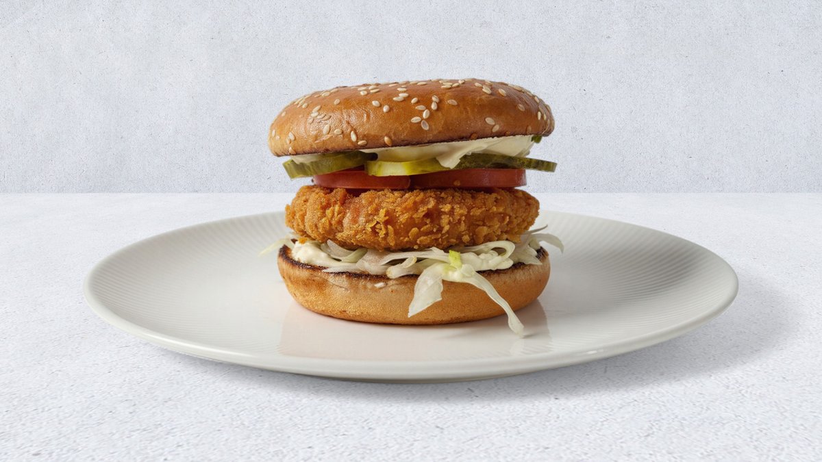 Panirani pileći burger, tartar sos, paradajz, kiseli krastavac, salata, pomfrit, zemicčka sa susamom