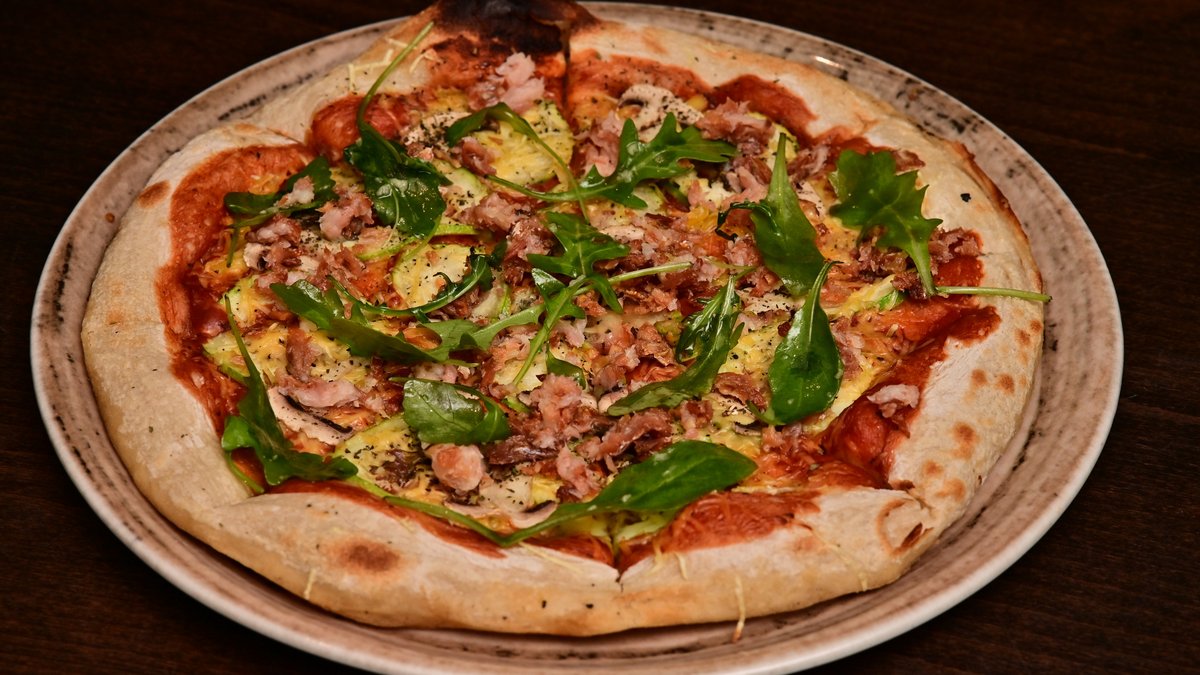 Pelat, kačkavalj, pesto, goveđa pršuta, čeri, piletina, rukola, origano