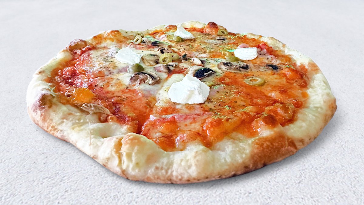 Pelat, mozarela, šunka, šampinjoni, pavlaka, origano
