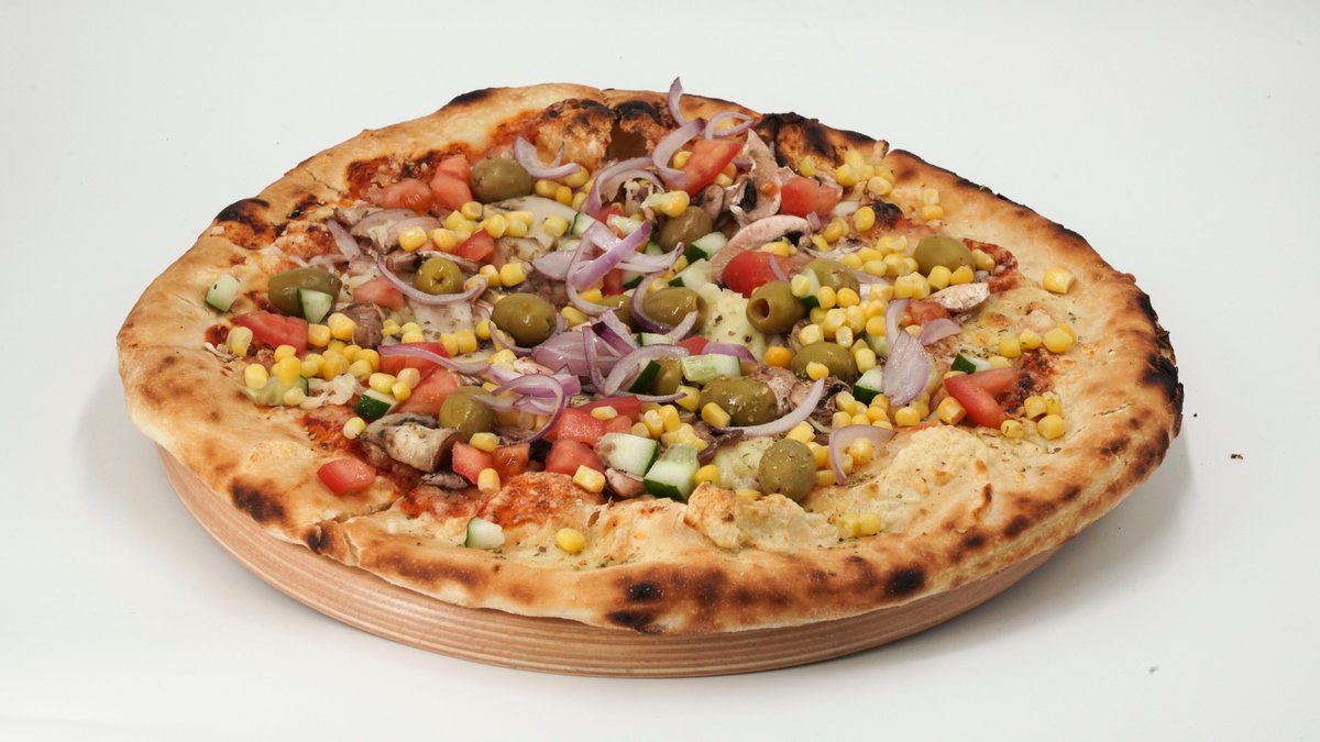 Pelat, šampinjoni, kukuruz, paprika, masline, luk, kačkavalj